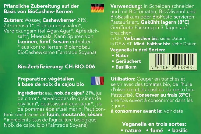 Vegan alternative to mozzarella, based on cashew nuts.