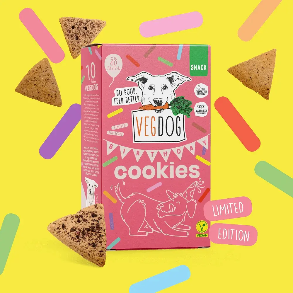 To celebrate VEGDOG’s 10th anniversary, we’ve created something truly special: our Birthday Cookies – the fruity limited edition for your dog! These crunchy treats with pear and blackcurrant bring birthday vibes to every day. Of course, they’re 100% vegan and lovingly baked as always. Whether it’s your dog’s birthday, a pawty with their best furry friends or just a little treat – our Birthday Cookies turn every day into a celebration! Available for a limited time – grab yours now and join the pawty! Let’s Pawty!