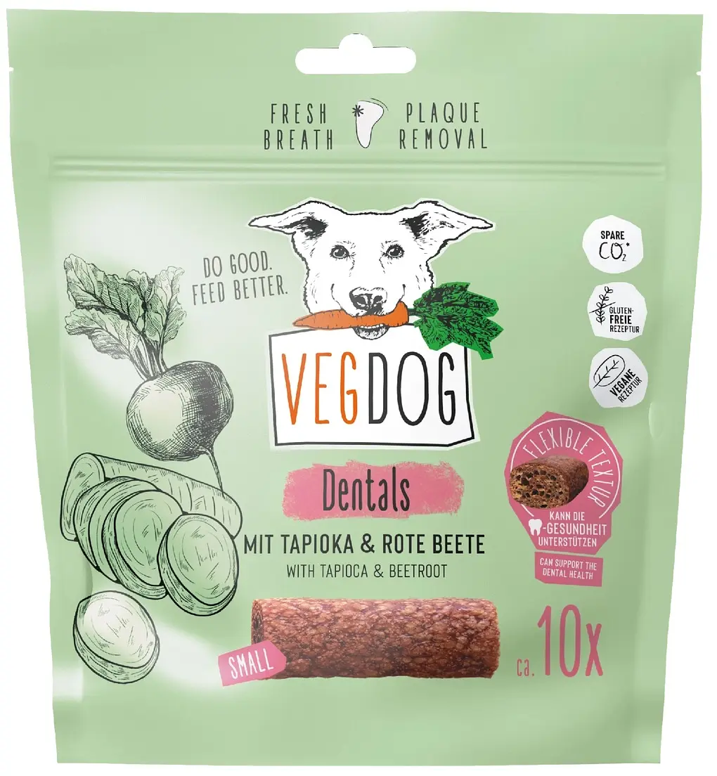The sponge structure of the VEGDOG DENTALS, developed together with veterinarians, removes plaque, massages the gums and has a cleaning effect on the teeth. The tapioca flour provides power for muscles and joints, and the beetroot it contains provides vitamin C. The ingredients also have a positive effect on digestion and cell renewal.