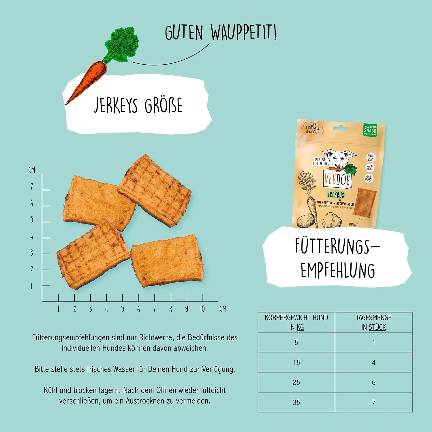 VEGDOG JERKEYS are purely vegetable and very healthy because of the vegetables. The beta-carotene contained in carrots is converted into vitamin A, which is necessary for your dog's eyesight, bones and protein synthesis.