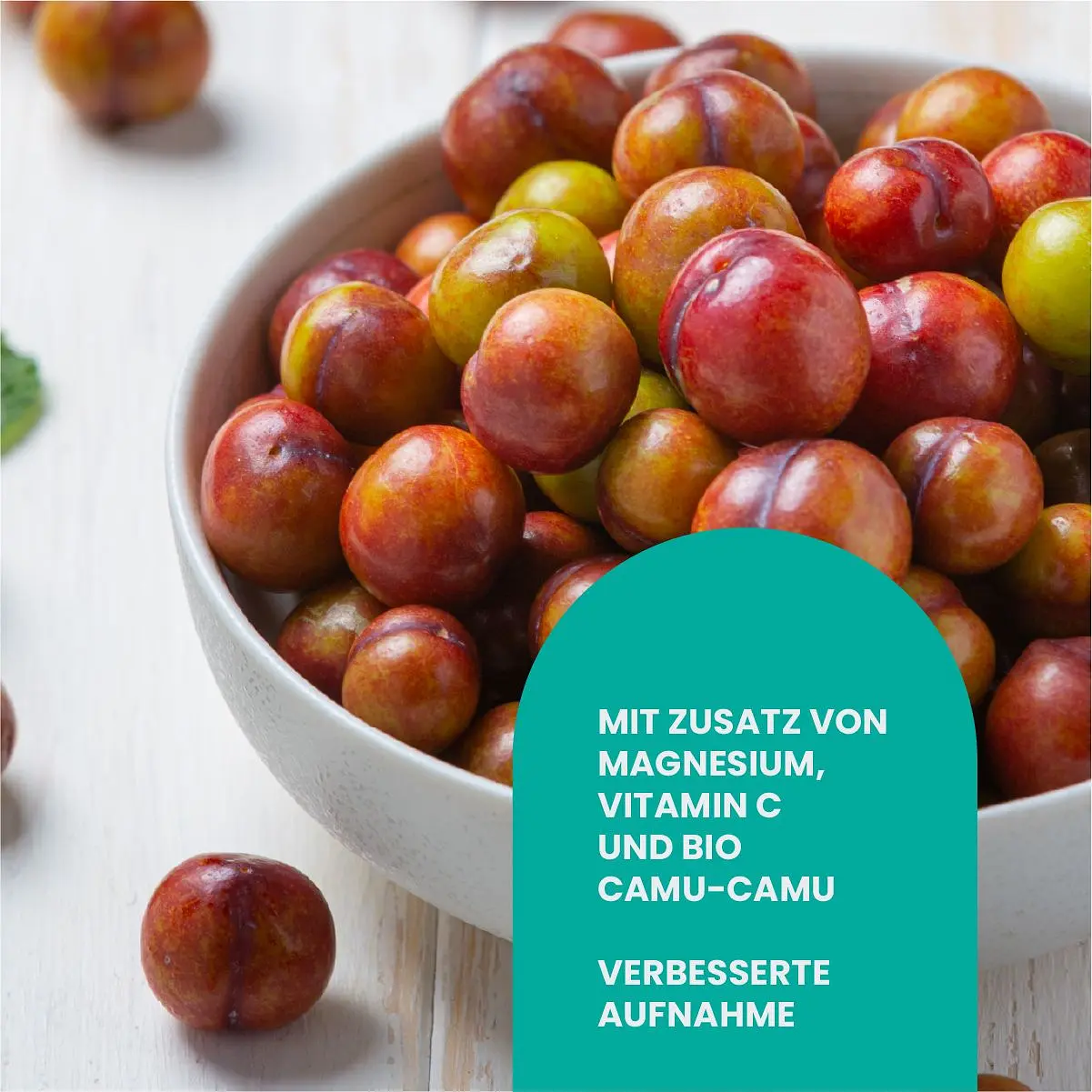 With natural organic Vitamin C and magnesium. Vitamin C significantly supports the functions of B-Vitamins.