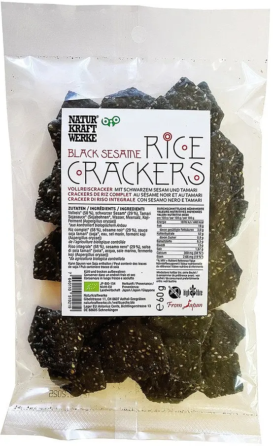 Wholegrain Rice Crackers with Black Sesame and Tamari by NaturKraftWerke – Crispy. Aromatic. Natural.