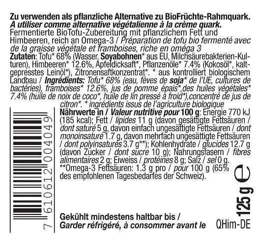 Tofu * 68% (eau, haricots SOYA * de l'UE, cultures de bactéries lactiques végétaliennes), framboises * 12,6%, jus de pomme *, huiles végétales * 7,4% (huile de coco *, huile de lin pressée à froid *), concentré de jus de citron *