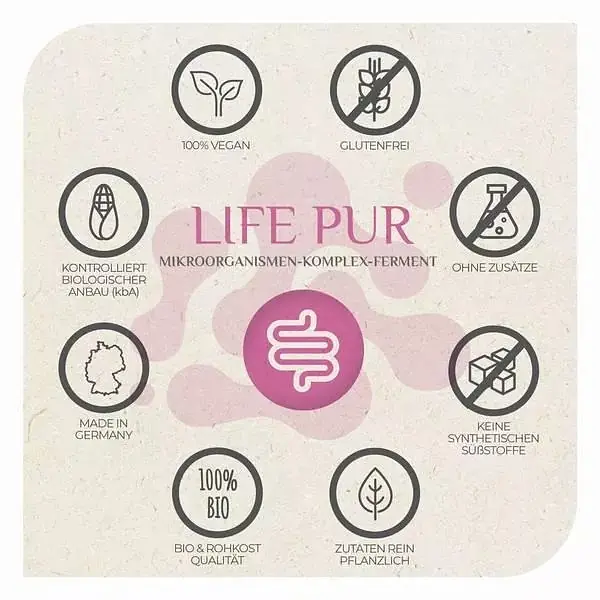 La préparation contient 33 souches de micro-organismes soigneusement cultivées et capables de se reproduire, qui produisent des enzymes, des vitamines, des acides aminés et des acides gras à chaîne courte précieux grâce à une fermentation douce. 100 % naturel, sans OGM, antiallergique et fabriqué selon les normes de qualité allemandes les plus strictes (certifié HACCP). Idéal pour une prise quotidienne ou en cure de 1 à 3 mois.