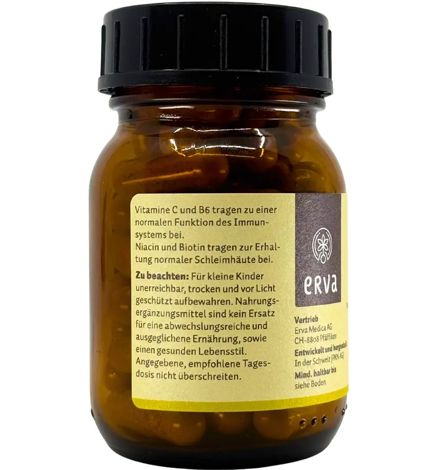 Les vitamines C et B6 contribuent à un fonctionnement normal du système immunitaire. La niacine et la biotine contribuent au maintien de muqueuses normales.