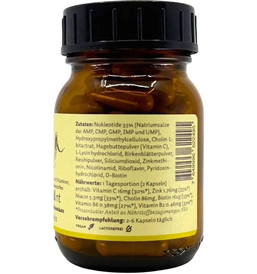 Nucléotides 33% (composé d'uridine-5`monophosphate, cytidine-5`monophosphate, inosine-5`monophosphate, guanosine-5`monophosphate, adénosine-5`monophosphate), hydroxypropylméthylcellulose, choline L-bitartrate, poudre de cynorrhodon (vitamine C), hydrochlorure de L-lysine, poudre de feuilles de bouleau, poudre de riz, dioxyde de silicium, méthionine de zinc, nicotinamide, ribofavine, chlorhydrate de pyridoxine, D-biotine