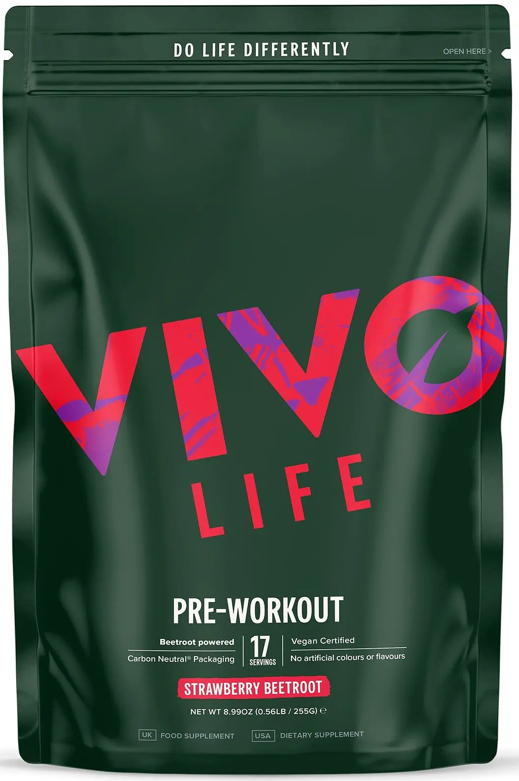 La poudre pré-entraînement au goût de fraise & betterave rouge de Vivo Life - pour un regain d'énergie durable et une amélioration des performances pendant l'entraînement.