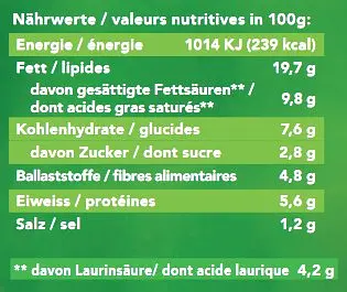 Eau, NOIX DE CAJOU* 19,7%, huile de coco *, jus de citron *, flocons de levure, balle de psyllium *, sirop de pomme *, sel marin, agargar *, gomme de caroube *, paprika *, riz et bois de hêtre