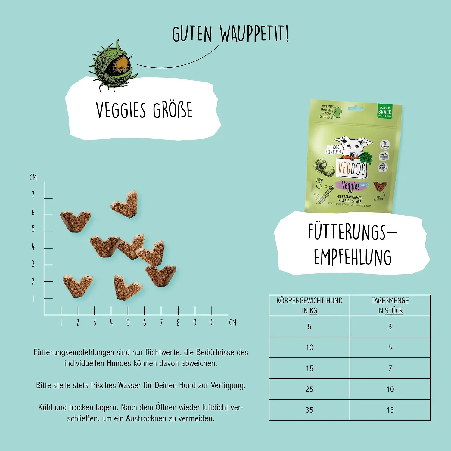 Stockage Les VEGDOG Beevys doivent être conservés dans un endroit frais et sec. Après ouverture, referme-les hermétiquement pour éviter qu'ils ne se dessèchent.