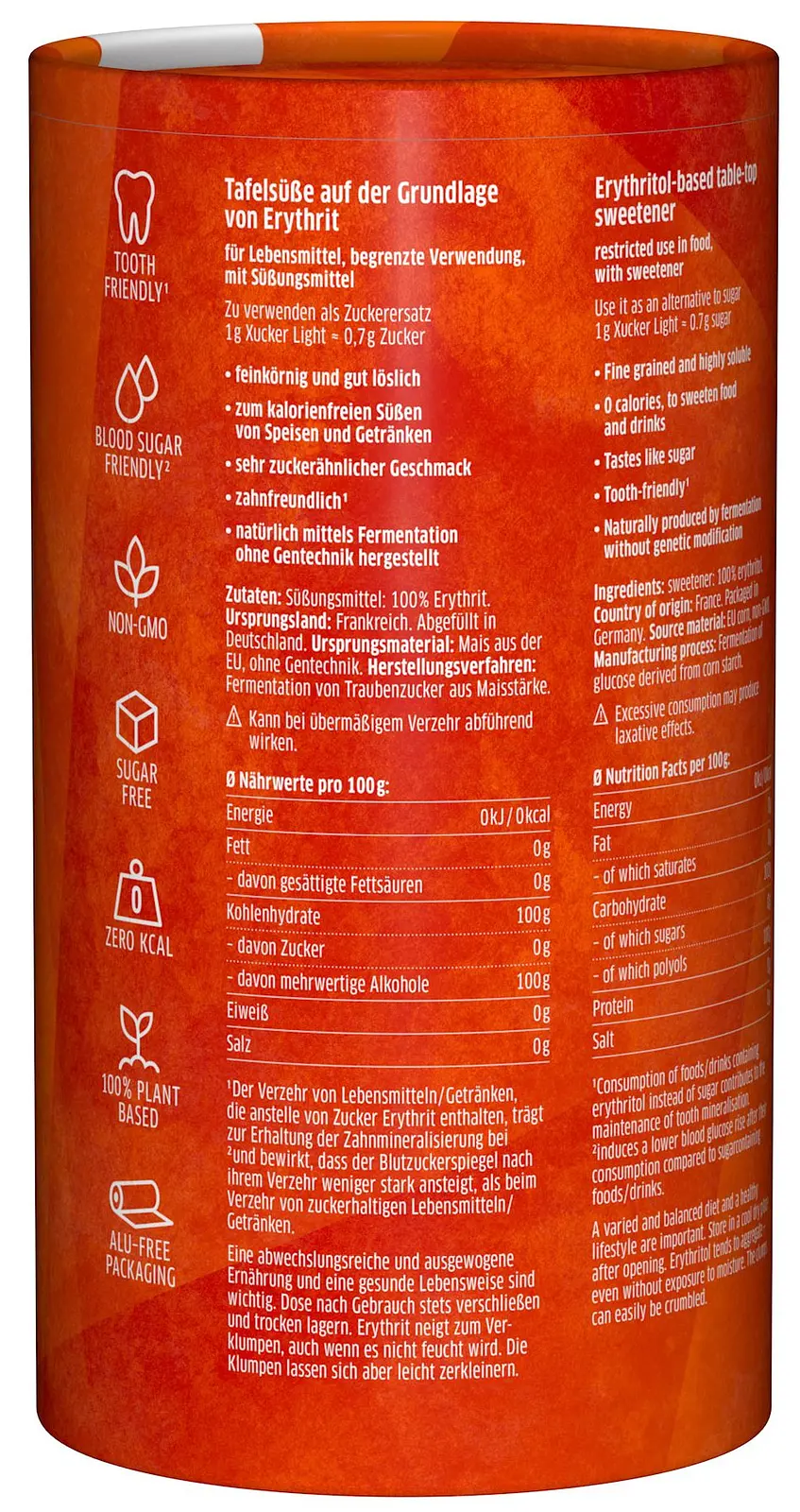 L'érythritol est un substitut du sucre sans calorie, naturel et sans danger pour les dents. Xucker Light avec érythritol est l'édulcorant idéal dans le cadre d'un régime calorique. La douceur correspond à environ 70% de la douceur du sucre. Les cristaux d'érythritol ressemblent au sucre ou au xylitol. L'érythritol est facilement soluble et de tous les alcools de sucre, il est le mieux toléré car il est excrété presque complètement inchangé. Au Japon, l'érythritol est utilisé dans de nombreux aliments et médicaments depuis 1990. Les diabétiques en particulier apprécient ses propriétés absolument neutres en sucre dans le sang.
