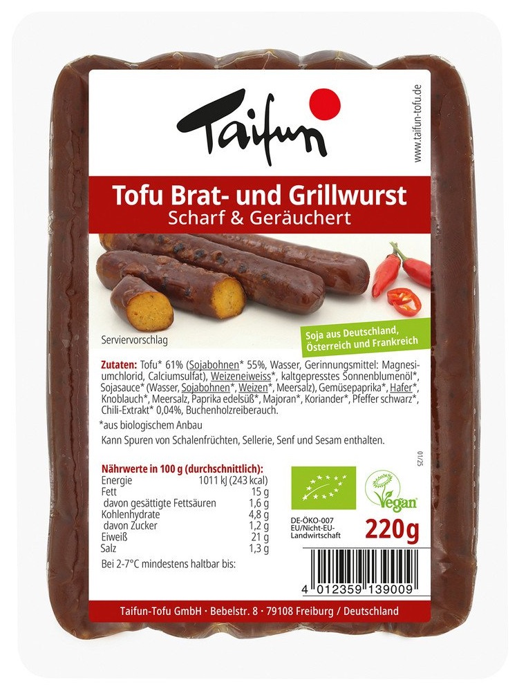 Die scharfe Räucherwurst von Taifun hat Charakter und macht auf dem Grill und in der Bratpfanne eine gute Figur. Bissfest, würzig und mit kräftiger Chilinote überzeugt sie nicht nur Tofufans. Ideal für für Hot Dogs, als pikante Einlage in Eintöpfen und natürlich fürs vegane Grillen.