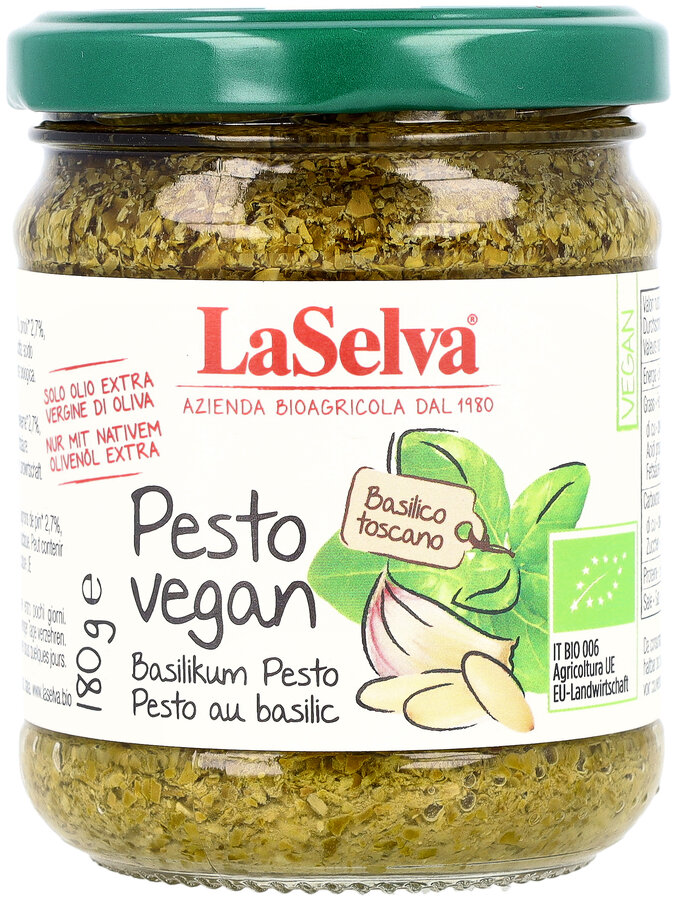 La Selva Verde Vegan Pesto Basil pesto is made from fresh basil leaves handgeernteten of LaSelva fields. The aromatic basil plants thrive in the hot climate of the Maremma.