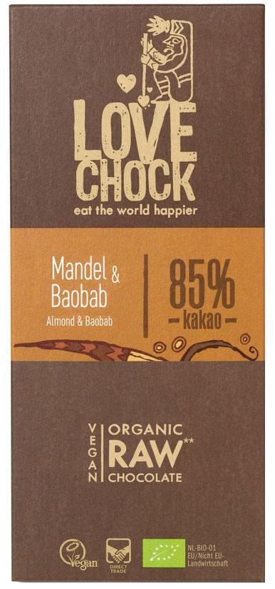 The cacao is processed at low temperatures. Lovechock is organic raw chocolate (raw cacao), is suitable for a vegan diet, is environmentally friendly, contains flavonoids, is dairy free, soy free and gluten free, contains no refined sugars, is sweetened with coconut blossom sugar and can contain traces of nuts.