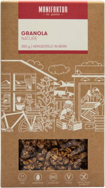The delicious organic granola from manifaktur in Bern is made from the best, gluten-free ingredients and processed with the greatest care.» Crunchy