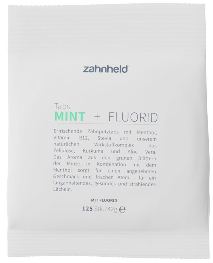 Mint Toothpaste Tablets with Fluoride by Zahnheld - Refreshing, convenient, and effective – for a long-lasting healthy smile» Refreshing toothpaste tablets with menthol and green mint leaf flavor