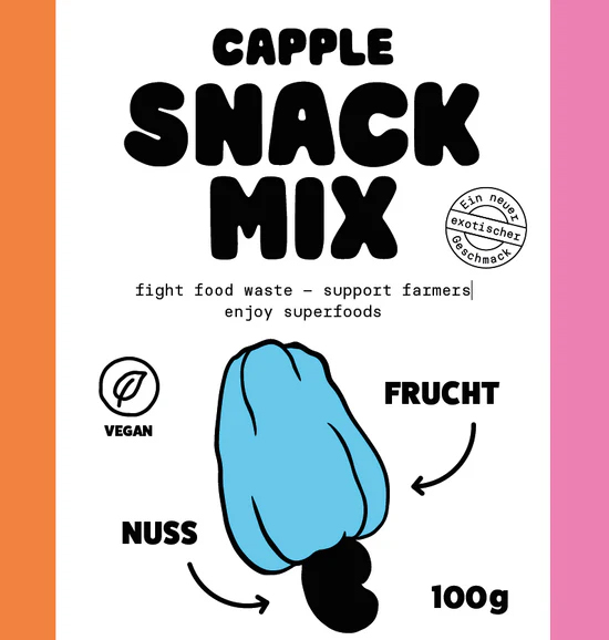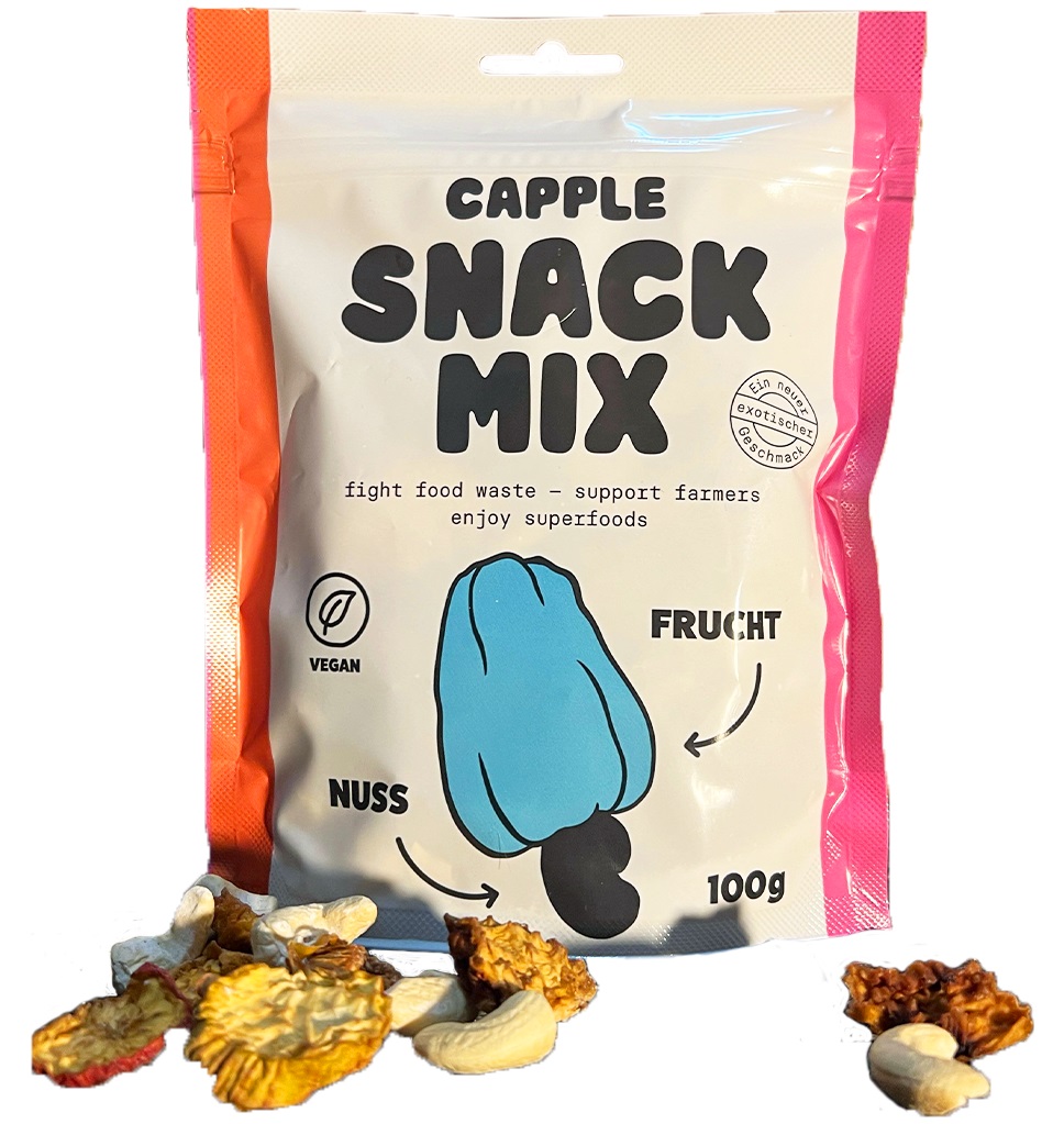 Le Capple Snack Mix réunit le meilleur du fruit de cajou : des noix de cajou croquantes et des pommes de cajou séchées au goût fruité et sucré. Avec 60% de pommes de cajou et 40% de noix de cajou, ce mélange raconte l’histoire du « Whole Fruit » et établit une nouvelle référence en matière de durabilité et d’innovation. Parfait pour une consommation responsable et pour réduire le gaspillage alimentaire.