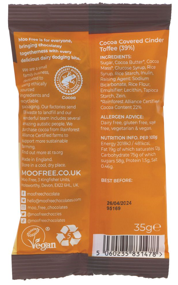Tous les chocolats Moo Free sont sans produits laitiers, sans gluten, sans soja, biologiques et conviennent aux végétariens et aux végétaliens.