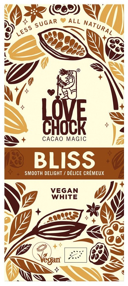 Lovechock Bliss Smooth Delight - chocolat blanc crémeux à base de beurre de cacao.Fabriqué avec les meilleurs ingrédients naturels et moins de sucre, Lovechock Bliss est non seulement 100 % végétalien et biologique, mais il est également emballé avec un film compostable. Savoure la magie du cacao sans souci !