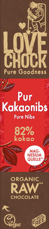 Lovechock Chocolat aux éclats de cacao en qualité crue.Les barres chocolatées Lovechock sont 100 % biologiques. Ce délicieux chocolat réalisé à partir de fèves de cacao de haute qualité, non torréfiées. Un procédé de fabrication qui conserve toutes leurs qualités nutritionnelles.